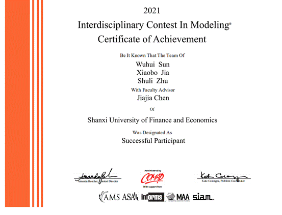 美国大学生数学建模竞赛(MCM/ICM)是唯一的国际性数学建模竞赛,也是世界范围内最具影响力的数学建模竞赛之一。赛题内容涉及经济、管理、环境、资源、生态、医学、安全等众多领域。竞赛要求三名在校本科生组为一个参赛队,在四天时间内,就指定的问题完成从建立模型、求解、验证到英文论文撰写的全部工作,体现了参赛选手应用数学思维和方法解决实际问题的能力,提升了学生的团队合作精神。竞赛的评审十分严格,获奖的参赛队伍都是在综合数学科学基础、英文表达能力、科研论文写作、计算机仿真能力和应用创新能力等方面激烈竞争中胜出的佼佼者。