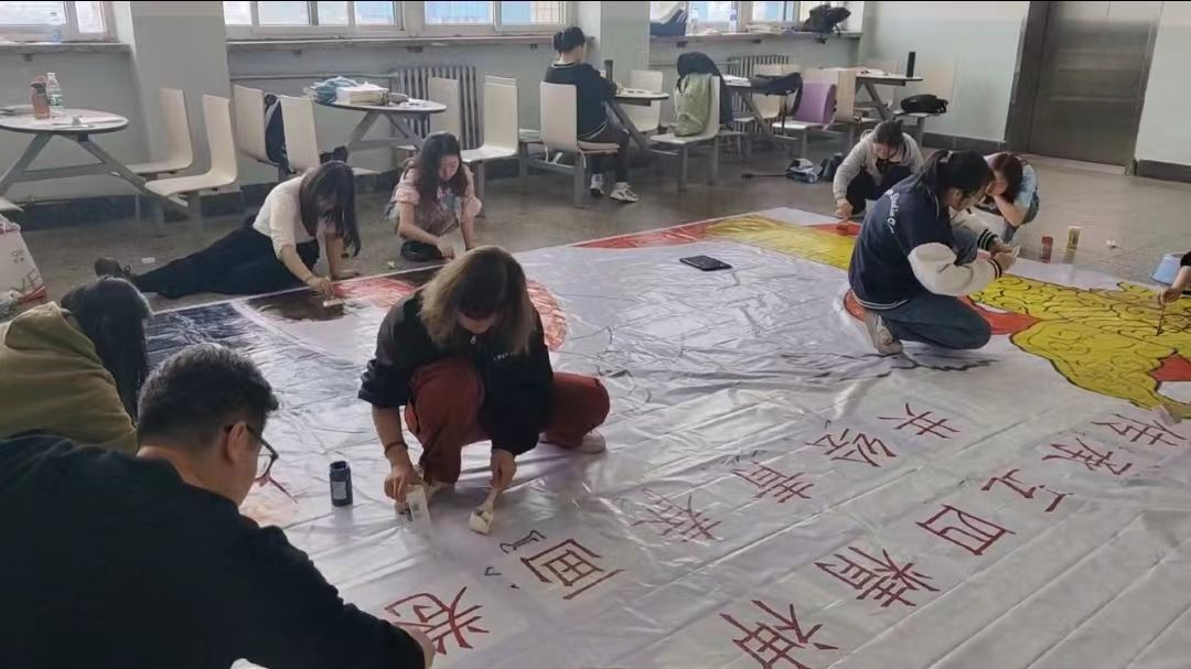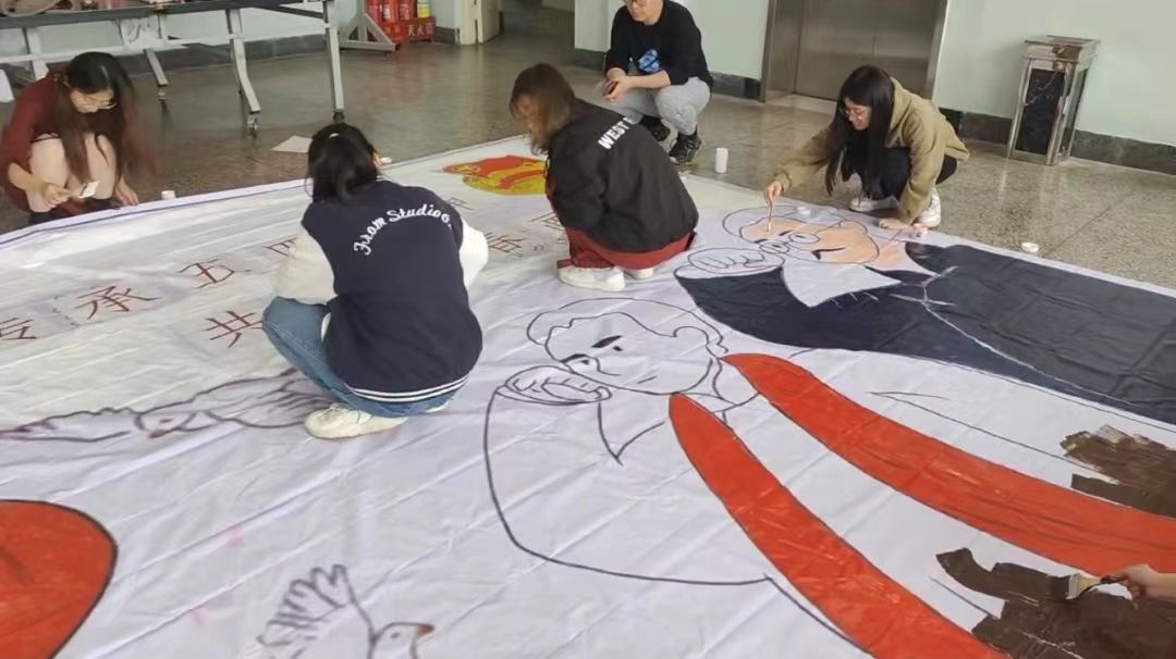 开展了“传承五四精神 共绘青春画卷” 主题手绘活动。活动现场,青年学子们手持画笔,调颜料、勾轮廓、涂点缀,在长5米,宽4米的画卷上彩绘心声。画卷里,呈现的是百年前的新青年,他们目光坚定、意气风发,高举马克思主义思想火炬,在风雨如晦的中国苦苦探寻民族复兴的前途。画卷外,新时代青年学子们怀着对先辈们的崇高敬意和对中华民族伟大复兴的热烈期盼,以笔做媒,以画寄情,勾勒五四画卷,点燃青春梦想,用实际行动彰显青春力量,展现青年风采。经过近三个小时的精心创作,一幅饱含着爱国之情、富有青春气息的画卷圆满完成。