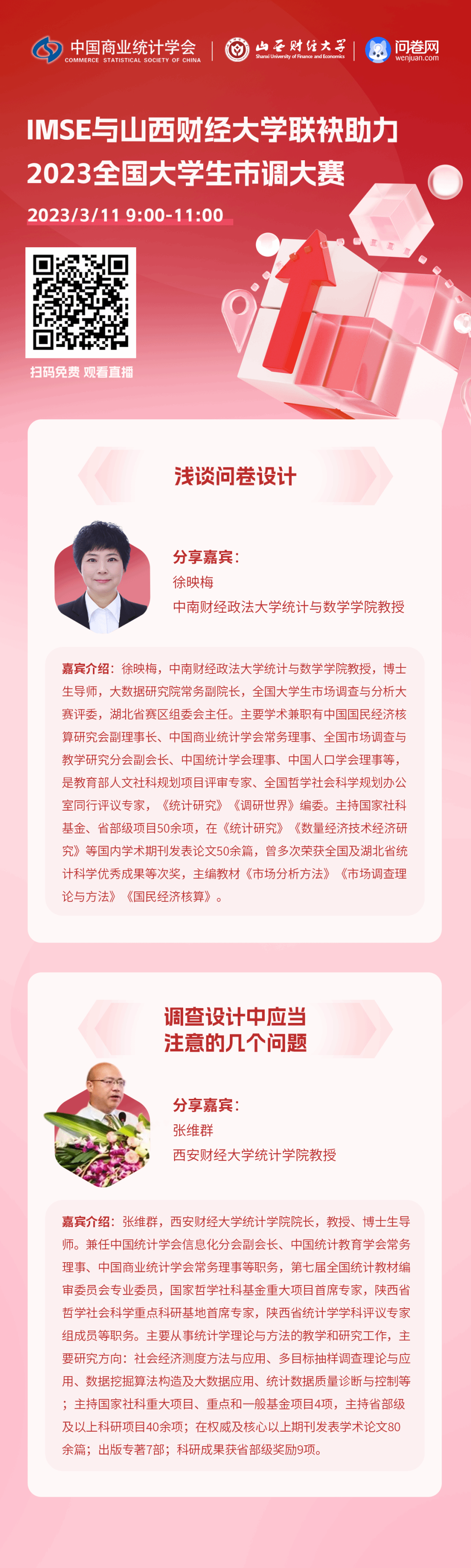 3月11日上午9:00-11:00,市调大赛系列公益培训继续开展,本次公益培训的分享嘉宾是:中南政法大学徐映梅教授和西安财经大学张维群教授。